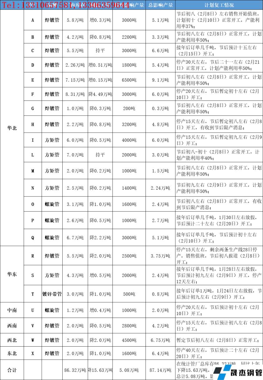 【停產(chǎn)】在統(tǒng)計(jì)焊接厚壁無(wú)縫鋼管管廠集中停產(chǎn)時(shí)間在臘月二十三(1月25日)至正月初八(2月8日)左右,平均停產(chǎn)時(shí)間17天,較去年縮短5天;最新統(tǒng)計(jì)管廠產(chǎn)能利用率40%左右,較去年春節(jié)前最后一次統(tǒng)計(jì)數(shù)據(jù)增長(zhǎng)6.86個(gè)百分點(diǎn);春節(jié)期間影響總產(chǎn)量87.14萬(wàn)噸,較去年減少21.17萬(wàn)噸,下降19.55%。