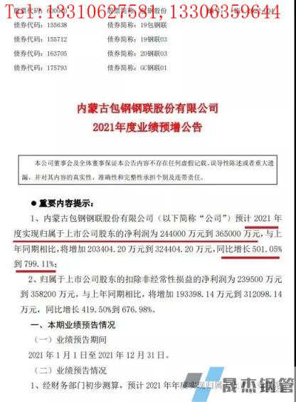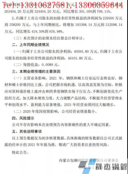 1月11日晚,鋼鐵板塊的牛股包鋼股份公布業(yè)績預(yù)告,預(yù)計2021年度實現(xiàn)歸屬于上市公司股東的凈利潤為24.4億元到36.5億元,與上年同期相比,將增加20.34億元到32.44億元,同比增長501.05%到799.11%;歸屬于上市公司股東的扣除非經(jīng)常性損益的凈利潤為23.95億元到35.82億元,與上年同期相比,將增加19.34億元到31.21億元,同比增長419.50%到676.98%。