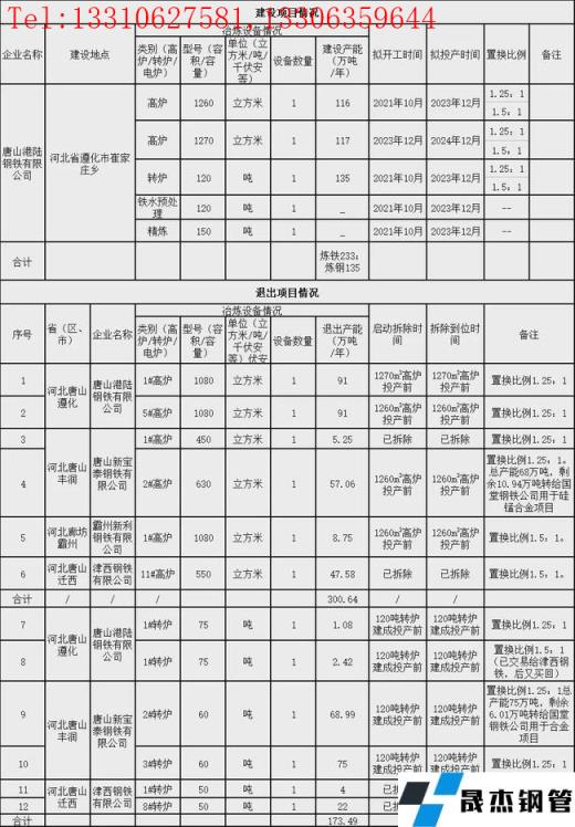 唐山港陸鋼鐵有限公司退出1080m3高爐2座、退出產(chǎn)能182萬噸;75t轉(zhuǎn)爐2座,退出產(chǎn)能3.5萬噸/年;唐山新寶泰鋼鐵有限公司450m3高爐1座,退出產(chǎn)能5.25萬噸/年;630m3高爐1座,退出產(chǎn)能57.06萬噸/年;60t轉(zhuǎn)爐2座,退出產(chǎn)能143.99萬噸/年;霸州新利鋼鐵有限公司1080m3高爐1座,退出產(chǎn)能8.75萬噸/年;津西鋼鐵有限公司退出550m3高爐1座,退出產(chǎn)能47.58萬噸/年;50t轉(zhuǎn)爐2座,退出產(chǎn)能26萬噸/年。共計退出煉鐵產(chǎn)能300.64萬噸,煉鋼產(chǎn)能173.49萬噸,所有項目將于新建項目建成投產(chǎn)前拆除。