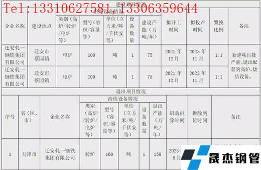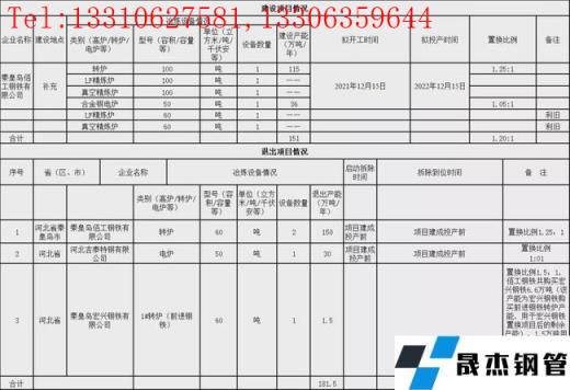 秦皇島佰工鋼鐵有限公司退出60t轉(zhuǎn)爐2座,產(chǎn)能150萬噸/年;河北吉泰特鋼有限公司退出50t電爐1座,產(chǎn)能30萬噸/年;秦皇島宏興鋼鐵有限公司退出60t轉(zhuǎn)爐1座,產(chǎn)能1.5萬噸/年。共計退出煉鋼產(chǎn)能181.5萬噸,所有項目將于新建項目建成投產(chǎn)前拆除。