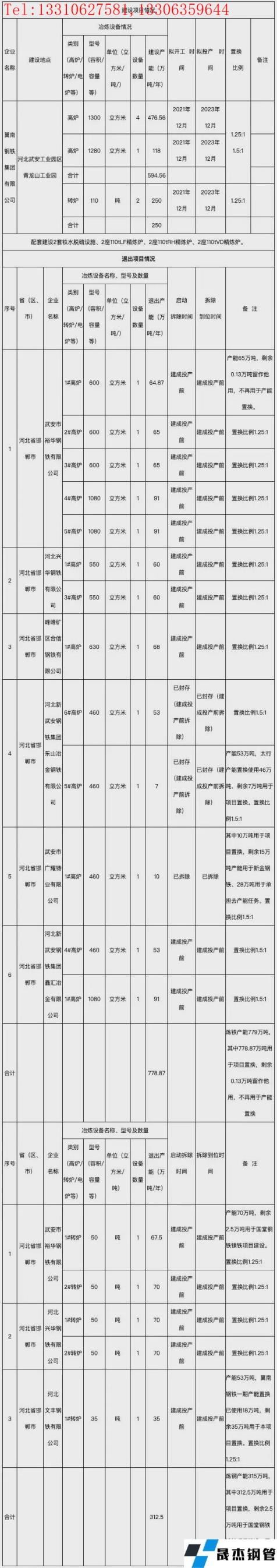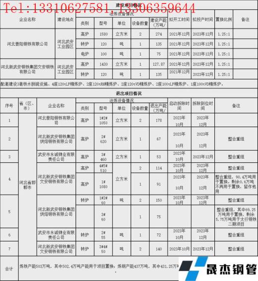 河北普陽鋼鐵有限公司退出高爐1050m3高爐2座,退出產(chǎn)能178萬噸/年。河北新武安鋼鐵集團烘熔鋼鐵有限公司退出620m3高爐1座,退出產(chǎn)能67萬噸/年;退出60t轉(zhuǎn)爐3座,產(chǎn)能225萬噸/年。武安市永誠鑄業(yè)有限責(zé)任公司退出460m3高爐1座,退出產(chǎn)能53萬噸/年;退出55t轉(zhuǎn)爐1座,產(chǎn)能72萬噸/年。河北新武安鋼鐵集團文安鋼鐵有限公司退出510m3高爐2座,退出產(chǎn)能114萬噸/年;退出1080m3高爐1座,退出產(chǎn)能91萬噸/年;退出50t轉(zhuǎn)爐2座,產(chǎn)能140萬噸/每年。共計退出煉鐵產(chǎn)能503萬噸,其中502.4萬噸產(chǎn)能用于項目置換;退出煉鋼產(chǎn)能437萬噸,其中431.25萬噸產(chǎn)能用于項目置換,所有項目將于2023年10月前拆除。