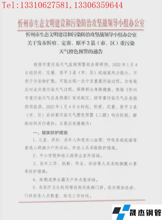 根據(jù)忻州市重污染天氣監(jiān)測預(yù)警組會(huì)商研判,2022年1月4日0時(shí)起 ,忻府、定襄、原平3縣(市、區(qū))啟動(dòng)重污染天氣橙色預(yù)警(二級(jí))響應(yīng)機(jī)制,解除時(shí)間另行通知。相關(guān)強(qiáng)制性污染減排措施為: