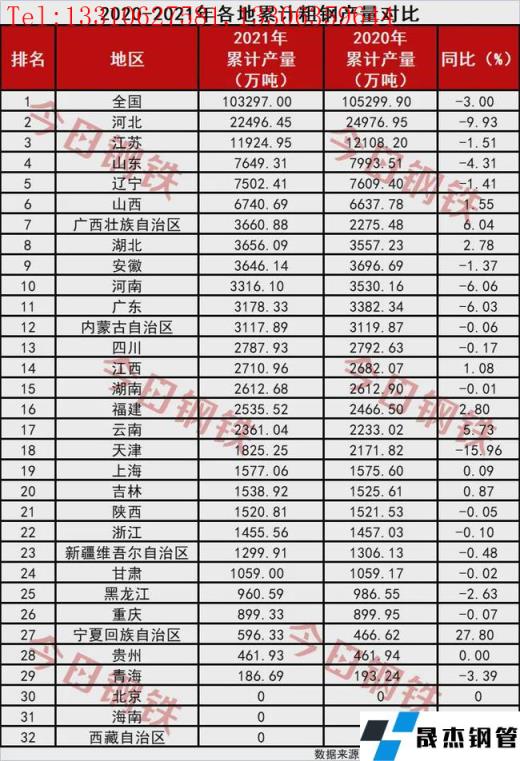從分省數(shù)據(jù)來看,對比2020年各省數(shù)據(jù),2021年4省市粗鋼產(chǎn)量同比降幅超5%。其中河北降9.93%、河南降6.06%,廣東和天津分別降6.03%、15.96%。詳見下表: