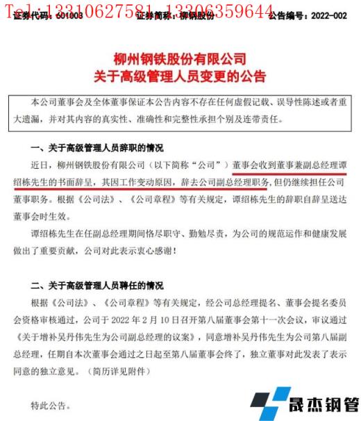 2月10日,柳州鋼鐵股份有限公司發(fā)布關(guān)于高級(jí)管理人員變更的公告。公告顯示,柳鋼股份董事會(huì)收到董事兼副總經(jīng)理譚紹棟的書面辭呈,其因工作變動(dòng)原因,辭去柳鋼股份副總經(jīng)理職務(wù),但仍繼續(xù)擔(dān)任柳鋼股份董事職務(wù)。