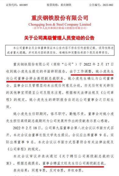 重慶鋼鐵姚小虎辭職!孟文旺獲聘高級(jí)副總裁