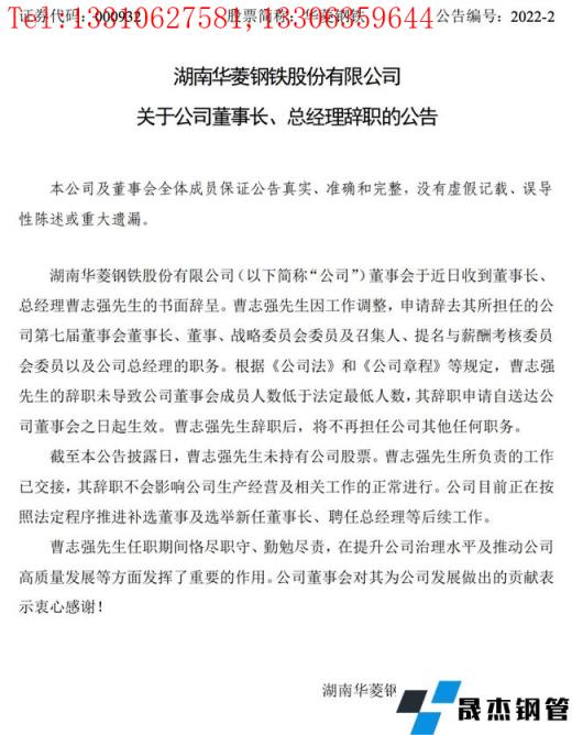 日前,湖南華菱鋼鐵股份有限公司發(fā)布公告稱,公司董事會(huì)于近日收到董事長(zhǎng)、總經(jīng)理曹志強(qiáng)的書面辭呈。曹志強(qiáng)因工作調(diào)整,申請(qǐng)辭去其所擔(dān)任的公司第七屆董事會(huì)董事長(zhǎng)、董事、戰(zhàn)略委員會(huì)委員及召集人、提名與薪酬考核委員會(huì)委員以及公司總經(jīng)理的職務(wù)。
