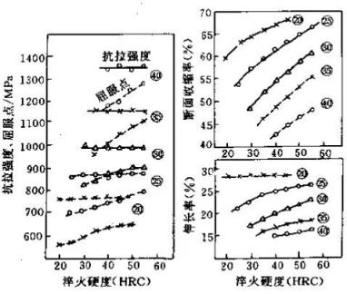 40Cr鋼經(jīng)過830℃加熱在不同淬火冷卻速度下獲得不同層淬火硬度后,通過不同的淬火溫度,回火得到不同的回火硬度,然后進行拉伸試驗。結(jié)果表明,抗拉強度取決于最后回火硬度,幾乎不受淬火硬度的影響;而屈服度強度、伸長率和斷面收縮率不僅取決于回火硬度,也與淬火硬度有很大關(guān)系,在回火得到相同硬度的條件下,這些性能指標(biāo)隨淬火硬度的升高而提高。因此,淬火回火工件不能只控制其回火后的硬度,還應(yīng)檢驗淬火后的硬度,以便檢查工件淬火是否充分,不充分的淬火,在大多數(shù)時候應(yīng)作為熱處理缺陷重新返工處理。