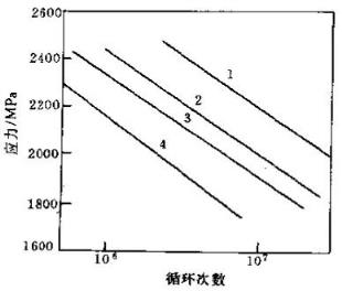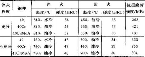 用40鋼、40Cr鋼和40CrMoA鋼加工成兩組疲勞試樣,第一組式樣在840℃正常淬火溫度下加熱淬火,硬度為56~57HRC,第二組用760℃淬火,淬火不充分,淬火硬度只能達到46~48HRC,將兩組式樣經(jīng)過不同溫度回火至相同硬度(均為33~36HRC)然后進行疲勞試驗,試驗結(jié)果列于表1.實驗表明,淬火不充分的第二組試樣的抗扭疲勞強度比充分淬火的第一組試樣的抗扭疲勞強度低10.8%~37%。