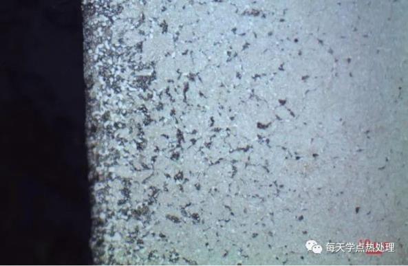 將碳氮共滲中工件的橫截面拋光后,在未腐蝕或輕微腐蝕的狀態(tài)下,使用光學(xué)顯微鏡在表面滲層中有時可觀察到一些分散的大小不一的黑色或暗灰色的斑點、黑帶和黑網(wǎng),這些深色的斑點、黑帶和黑網(wǎng),統(tǒng)稱為黑色組織。黑色組織的深度一般不超過0.05mm。深色的斑點是一些主要沿奧氏體晶界分布的大小不一的孔洞。黑色帶通常出現(xiàn)在距表面0.03mm深度內(nèi),黑帶的內(nèi)測往往可觀察到黑色網(wǎng),主要由于表層形成了某些合金元素的碳氧化物、氮氧化物和碳化物等小顆粒,使奧氏體中合金元素貧化,導(dǎo)致淬透性降低而形成了托氏體的結(jié)果。碳氮共滲的黑色組織類似于氣體滲碳的內(nèi)氧化,使表面硬度下降,有益的殘余壓應(yīng)力減小,或表面形成殘余拉應(yīng)力,導(dǎo)致疲勞強度的降低。20Cr2Ni4A鋼碳氮共滲試樣表面黑色組織可使彎曲疲勞強度降低約6%。