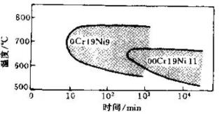 然而在某個特定溫度區(qū)間和時間參數(shù)下進行熱處理或在某個溫度區(qū)間長期使用時,由于含鉻碳化物沿晶界析出將導(dǎo)致晶界腐蝕抗力的急劇下降。表示發(fā)生晶界腐蝕的熱處理溫度和時間關(guān)系曲線叫做時間-溫度-敏化曲線(T-T-S曲線)。圖6 就是奧氏體不銹鋼的典型T-T-S曲線。在C型曲線的右側(cè)熱處理狀態(tài)下,不銹鋼易產(chǎn)生晶間腐蝕。