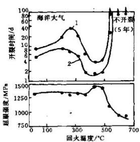 強度強烈地影響馬氏體不銹鋼的應(yīng)力腐蝕開裂行為。淬火狀態(tài)下其應(yīng)力腐蝕開裂的傾向很大,隨著回火溫度的升高,應(yīng)力腐蝕抗力顯著得到改善,但是對于Cr12型馬氏體不銹鋼,在400-550℃溫度區(qū)間回火時,由于M23C6型碳化物的析出造成基體局部貧鉻,會出現(xiàn)應(yīng)力腐蝕抗力低谷。見圖10 。