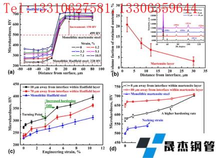 總之,盡管哈德菲爾德層為馬氏體貢獻了 20% 的碳,但仍保留了它的高應變硬化能力。這一點對于本研究中元素擴散策略的成功具有戰(zhàn)略意義。首先,哈德菲爾德層的初始硬化率與整體鋼相當。根據元素分布結果(圖 2(a)),兩層之間存在過渡層(約20μm厚),其厚度根據硬度分布增加到約45μm(圖 4)。該結果表明復合鋼由哈德菲爾德層、馬氏體層和梯度層組成。幾項關于梯度結構的有趣研究表明,在細晶粒和粗晶粒之間的界面處產生的應力不相容性可能導致應變梯度,這將通過梯度區(qū)域中的幾何必要位錯 (GND) 來適應 。