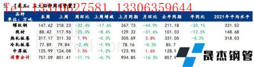 據(jù)統(tǒng)計,本周五大品種周消費量除熱軋板卷和中厚板,其余品種均有下降,合計周消費降至757.09萬噸,環(huán)比減少94.32萬噸,降幅11.1%;上周五大品種周合計消費851.41萬噸,環(huán)比減少61.52萬噸,降幅6.7%。從目前五大品種周消費來看,春節(jié)臨近,休市在即,需求基本停滯,周消費量預期內下降。