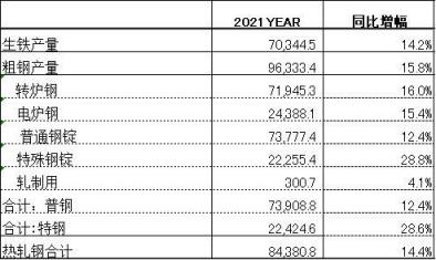 根據(jù)日本鋼鐵協(xié)會的統(tǒng)計(jì),2021年日本生鐵產(chǎn)量為7034萬噸,同比增長14.2%。粗鋼產(chǎn)出當(dāng)中,轉(zhuǎn)爐鋼產(chǎn)量為7194.5萬噸,同比提高16%,電爐鋼產(chǎn)量達(dá)2438.8萬噸,同比增長15.4%。