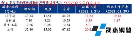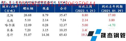 本周東三省建筑鋼材現(xiàn)貨庫(kù)存增加較多,增幅明顯超上周,其中螺紋鋼現(xiàn)貨庫(kù)存52.8萬(wàn)噸,線盤15.02萬(wàn)噸,建材社會(huì)庫(kù)存總量為67.82萬(wàn)噸,較上周增20.24萬(wàn)噸,增幅高達(dá)42.54%。隨著春節(jié)的臨近,北方下游終端工程進(jìn)入全停工狀態(tài),需求已無(wú),出貨趨零,加之各個(gè)無(wú)縫鋼管廠家廠庫(kù)前移至市場(chǎng)各倉(cāng)庫(kù)的現(xiàn)貨相對(duì)較多,社庫(kù)開(kāi)始大幅度累庫(kù)。