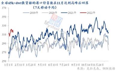 根據(jù)調(diào)研,10月份全球鐵礦石發(fā)運(yùn)出現(xiàn)了大幅下降,10月環(huán)比降幅達(dá)5.8%至1.33億噸,傳導(dǎo)至12月中國(guó)海運(yùn)鐵礦石進(jìn)口環(huán)比下滑18%,至8500萬(wàn)噸左右,同比下降11%,至近19個(gè)月低點(diǎn)。盡管12月鐵礦石發(fā)運(yùn)回暖,但是由于10月以及11月運(yùn)輸需求的下滑,多余運(yùn)力需要被消化:太平洋板塊率先開(kāi)始持續(xù)傳導(dǎo)下行壓力,致使租金價(jià)格下跌;西澳大利亞至中國(guó)C5航線運(yùn)費(fèi)于12月10日出現(xiàn)大幅下跌,跨太平洋C10航線也于當(dāng)周緊跟下行趨勢(shì)。市場(chǎng)上租家也看空海岬型船海運(yùn)市場(chǎng):12月中國(guó)至巴西的C14空載航線同樣下跌。與此同時(shí),圣誕節(jié)假期期間也導(dǎo)致了交易節(jié)奏放緩,此外,許多租家也都想盡可能規(guī)避卷土重來(lái)的新冠疫情及相關(guān)港口規(guī)定。往后進(jìn)入2022年1月,國(guó)際干散貨海運(yùn)市場(chǎng)正式步入淡季。