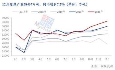 2021年我國(guó)原煤產(chǎn)量整體呈現(xiàn)前低后高走勢(shì),尤其10月份增產(chǎn)保供、引導(dǎo)煤價(jià)回歸合理區(qū)間以來(lái),我國(guó)原煤產(chǎn)量連續(xù)三個(gè)月屢創(chuàng)年內(nèi)新高。2021年第四季度原煤合計(jì)生產(chǎn)11.1億噸,約占全年產(chǎn)量27.3%,其中12月生產(chǎn)原煤3.8億噸,約占全年產(chǎn)量9.5%,保供增產(chǎn)效果顯著。