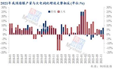 煤炭在供應(yīng)大幅增產(chǎn)下,國(guó)內(nèi)需求同比下降。與2020年12月同期相比,去年12月下游需求明顯高位回落,電力生產(chǎn)同比下降。12月,發(fā)電7234億千瓦時(shí),同比下降2.1%,11月為同比增長(zhǎng)0.2%,降幅明顯擴(kuò)大。其中火力發(fā)電12月同比下降近5%。