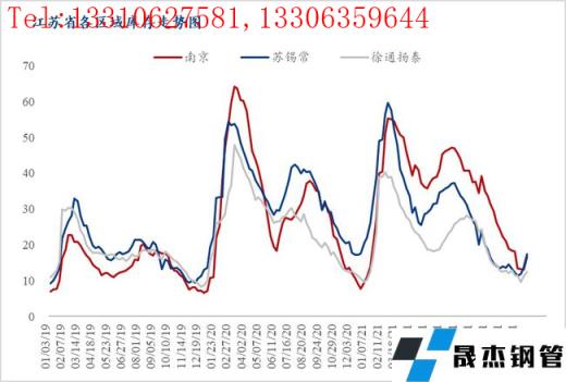 如上圖所示,2020年1月23日省會(huì)南京市場(chǎng)庫存占全省現(xiàn)貨庫存的21%左右,屬全年較低水平;而4月9日前后基本占全省庫存的41%;20年上半年南京市場(chǎng)庫存均保持較高水平,而下半年開始庫存便逐漸走低,蘇錫常庫存累庫增加。2021年1月8日南京庫存占全省庫存的24%,從4月初開始到本年度結(jié)束,南京庫存占比基本維持在40-42%左右,11月5日占比最高達(dá)到年度最高值,約50/%。2021年全年,南京市場(chǎng)庫存均保持較高水平,僅在年初階段,蘇錫常總庫存略高于南京。整體來看,今年南京市場(chǎng)現(xiàn)貨資源一直處于相對(duì)充裕的狀態(tài),且部分無縫厚壁鋼管廠家?guī)齑媲耙埔彩潜WC該市場(chǎng)建材供給較為穩(wěn)定的重要因素,而徐通揚(yáng)泰區(qū)域則因價(jià)格波幅巨大,市場(chǎng)參與者主動(dòng)囤貨意愿不高,全年庫存相較去年小幅減量。
