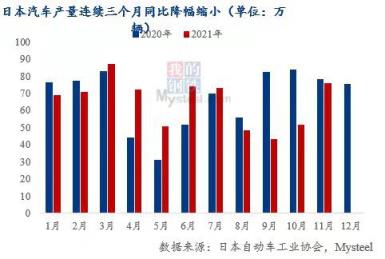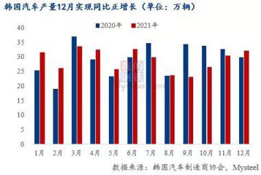 2021年11月日本汽車產(chǎn)量76萬(wàn)輛,環(huán)比增長(zhǎng)47%,截至2021年11月,日本汽車產(chǎn)量同比降幅連續(xù)三個(gè)月收窄;韓國(guó)2021年12月汽車產(chǎn)量32萬(wàn)輛,環(huán)比增長(zhǎng)5%,同比增長(zhǎng)7%,是近四個(gè)月首次實(shí)現(xiàn)同比增長(zhǎng)。