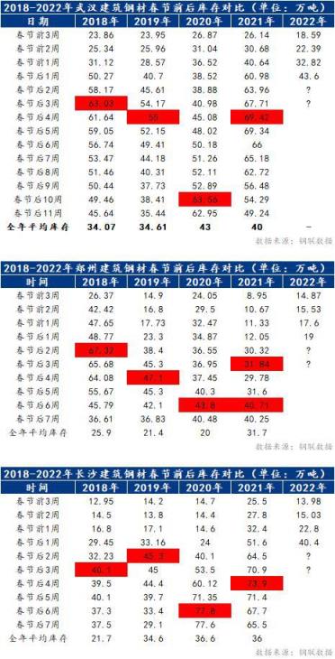 小編匯總近5年春節(jié)后7周中南區(qū)域建筑厚壁無縫鋼管庫存變化及庫存峰值時(shí)間節(jié)點(diǎn)。具體情況如下表所示: