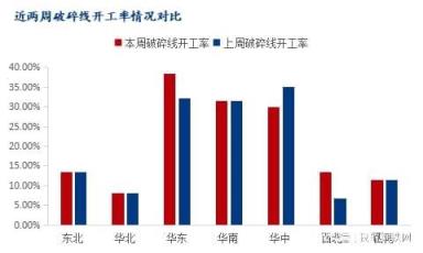截止2月09日,統(tǒng)計(jì)全國242條廢鋼破碎線開工情況,廢鋼破碎線開工率為26.64%,較上周增2.87%,本周全國廢鋼破碎線開工率小增。全國區(qū)域?qū)Ρ瓤?,東北、華北、華南、西南地區(qū)破碎線開工率較上周持平,華東地區(qū)破碎線開工率較上周增6.25%,華中地區(qū)破碎線開工率較上周降5%,西北地區(qū)破碎線開工率較上周增6.67%。