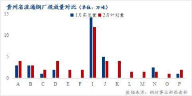 2、2月份貴州省建筑厚壁無(wú)縫鋼管資源計(jì)劃投放量45萬(wàn)噸,較上個(gè)月增加11萬(wàn)噸萬(wàn)噸,增幅達(dá)32.35%,主要是2月中旬本地電爐企業(yè)基本復(fù)產(chǎn),資源投放加大,而貴州價(jià)格逐步擺脫洼地,春節(jié)期間省外累庫(kù)速度明顯,2月份恐加大對(duì)貴州區(qū)域資源投放。
