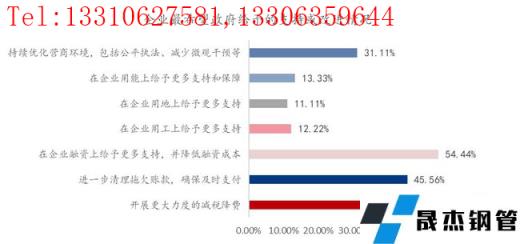 8、對于2022年發(fā)展前景預(yù)期偏謹(jǐn)慎。本次調(diào)研樣本企業(yè)中對2022年發(fā)展前景預(yù)期持樂觀或比較以及非常樂觀的企業(yè)占比57.58%,不太樂觀或比較悲觀的企業(yè)占比為33.33%,因此對于未來一段時間的投入情況,持適當(dāng)或大規(guī)模增加的企業(yè)占比為46.46%,暫不增加投入的占比為43.43%,適當(dāng)縮減或退出部分業(yè)務(wù)的企業(yè)占比為10.10%,由此看來,目前整體經(jīng)濟(jì)環(huán)境的確面臨一定壓力,導(dǎo)致企業(yè)信心相對保守,而主要原因是經(jīng)濟(jì)下行壓力下,穩(wěn)增長政策力度不夠。企業(yè)希望得到政府的支持與改進(jìn)的呼聲最大的是開展更大力度的減稅降費(fèi)以及降低融資成本,進(jìn)一步清理拖欠賬款,確保及時支付,持續(xù)優(yōu)化營商環(huán)境,公平執(zhí)法、減少微觀干預(yù)。