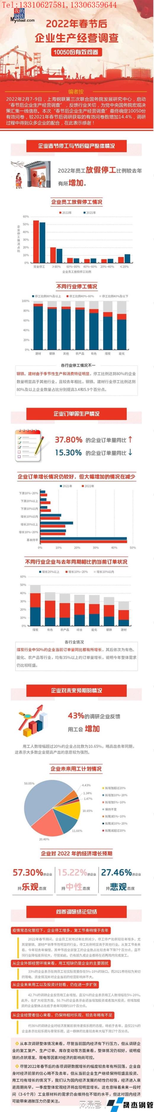 2022年2月7-9日,上海鋼聯(lián)第三次聯(lián)合國(guó)務(wù)院發(fā)展研究中心,啟動(dòng)“春節(jié)后企業(yè)生產(chǎn)經(jīng)營(yíng)調(diào)查”,反饋行業(yè)關(guān)切,為黨中央國(guó)務(wù)院宏觀決策匯集一線信息。本次“春節(jié)后企業(yè)生產(chǎn)經(jīng)營(yíng)調(diào)查”最終確定10050份有效問(wèn)卷,較2021年春節(jié)后調(diào)研獲取的有效問(wèn)卷數(shù)增加14.4%。 具體結(jié)論如下: