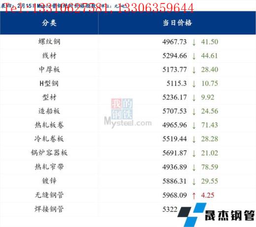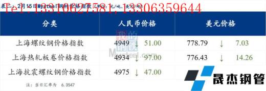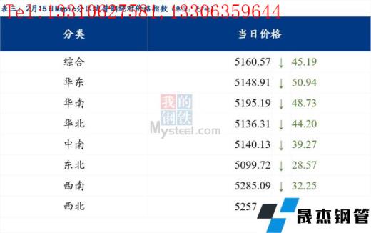 2月15日普鋼絕對(duì)價(jià)格指數(shù)變化:綜合指數(shù)5160.57,下跌45.19;螺紋鋼指數(shù)4967.73,下跌41.5;線(xiàn)材指數(shù)5294.66,下跌44.61;熱軋板卷指數(shù)4965.96,下跌71.43;冷軋板卷指數(shù)5519.44,下跌28.28;中厚板指數(shù)5173.77,下跌28.4。
