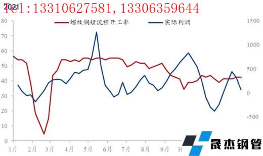 而對(duì)于2021年的數(shù)據(jù)來(lái)說(shuō)無(wú)論是相關(guān)分析還是回歸分析結(jié)果表現(xiàn)出與其他年份有不同的結(jié)果,這與2021年的特殊情況有關(guān)。由于2021年螺紋鋼價(jià)格的急劇變化,導(dǎo)致電弧爐實(shí)際利潤(rùn)具有了極強(qiáng)的波動(dòng)性,而且由于能耗雙控,從8月底電弧爐無(wú)縫厚壁鋼管廠家被嚴(yán)格限產(chǎn),導(dǎo)致了電弧爐開工率有近20%左右的持續(xù)下降,創(chuàng)造了歷史低位,政策以及成材價(jià)格變動(dòng)明顯干擾了數(shù)據(jù)的觀測(cè),如下圖所示:
