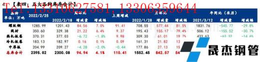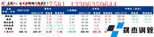 庫(kù)存方面,五大品種厚壁無(wú)縫鋼管總庫(kù)存春節(jié)后連續(xù)累增四周,環(huán)比上周增加94.94萬(wàn)噸,增幅4.1%。分品種看,建材庫(kù)存增加105.78萬(wàn)噸,增幅為6.9%;板材庫(kù)存減少10.84萬(wàn)噸,降幅1.4%;分指標(biāo)看,無(wú)縫厚壁鋼管廠家?guī)齑姝h(huán)比增加8.69萬(wàn)噸,增幅1.4%;社會(huì)庫(kù)存環(huán)比增加86.25萬(wàn)噸,增幅5.2%。