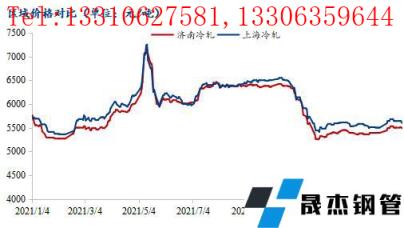 2021年上海冷軋板卷最高價(jià)7250元/噸,最低價(jià)5360元/噸,均價(jià)6014元/噸,全年高低價(jià)差1890元/噸。濟(jì)南冷軋板卷最高價(jià)7170元/噸,最低價(jià)5250元/噸,均價(jià)5914元/噸,全年高低價(jià)差1920元/噸。同一交易日上海-濟(jì)南冷軋價(jià)差全年最高240元/噸,最低-250元/噸,均價(jià)99元/噸。