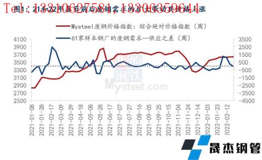 從圖1可以看出,21年和22年的冬儲期間,廢鋼價格隨著需求的擴(kuò)大出現(xiàn)了上漲,其實(shí)縱觀2021年1月至當(dāng)前的廢鋼價格走勢,可以看出其走勢與61家無縫厚壁鋼管廠家廢鋼的供需變化走勢有一定的關(guān)聯(lián)性。所以2022年1月以來廢鋼價格的走高,其中一個原因可以認(rèn)為是無縫厚壁鋼管廠家由于需要冬儲而導(dǎo)致的廢鋼需求增加,拉動了廢鋼價格的上漲。