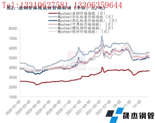 由于廢鋼的定價權(quán)基本掌握在無縫厚壁鋼管廠家手中,其價格彈性往往大于成材,如果行情不好導(dǎo)致成材價格出現(xiàn)下跌,那么無縫厚壁鋼管廠家就會降低自身的廢鋼消耗量,下調(diào)廢鋼價格,所以廢鋼價格可以看成是隨著成材價格走勢而變化,處于相對被動的位置。由圖2可以看出,從近三年的價格走勢可以看出,廢鋼價格與五大材的價格走勢關(guān)聯(lián)性很高。今年1月以來截止當(dāng)前廢鋼的漲幅為2.49%,五大材的漲幅也均在2%-3%之間,所以今年1月份以來成材價格上漲也支撐了廢鋼價格的上漲。