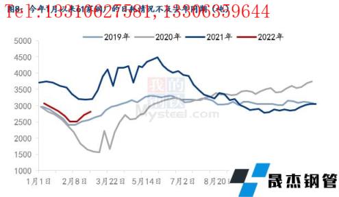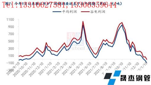 為什么廢鋼資源會存在階段性偏緊?其實(shí)在第一部分中已經(jīng)討論過,廢鋼資源近幾年內(nèi)都是在每年的1月到節(jié)后的一段時間內(nèi)存在著供需缺口,主要是因?yàn)閺U鋼加工基地節(jié)前會放假,節(jié)后復(fù)工較晚導(dǎo)致的市場資源偏緊,無縫厚壁鋼管廠家因此在這段時間內(nèi)收廢較為困難,今年也不例外。但今年1月份61家無縫厚壁鋼管廠家的到貨量同比去年有所降低(圖4所示),到貨量同比有所降低,分析下來大概有三方面原因:一是由于產(chǎn)廢的制造業(yè)企業(yè)放假較早、房地產(chǎn)行業(yè)的走弱,使得社會加工廢鋼減少,外加疫情阻礙了廢鋼資源的流通,導(dǎo)致了廢鋼加工基地收廢困難。今年1月293家樣本基地庫存同比降低有30萬噸左右(圖5所示);二是今年1月以來五大材的總產(chǎn)量低于去年同期(圖6所示);三是電爐廠自今年1月以來普遍處于虧損的狀態(tài),利潤情況要遠(yuǎn)差于去年同期(圖7所示)。后面兩方面原因?qū)е铝藷o縫厚壁鋼管廠家降低了廢鋼消耗量,所以今年1月以來61家樣本無縫厚壁鋼管廠家的廢鋼日耗同比低于去年(圖8所示),需求端的走弱聯(lián)動了供應(yīng)端一起走弱。所以以上三方面原因綜合導(dǎo)致了今年1月份來無縫厚壁鋼管廠家收廢量不及去年同期。