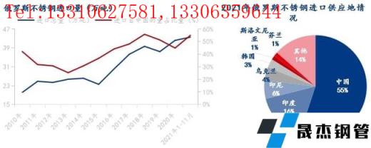 在需求增長(zhǎng)帶動(dòng)下,近年來俄羅斯不銹鋼進(jìn)口量大幅提升,2021年1-11月進(jìn)口量累計(jì)約43.57萬噸,其中中國進(jìn)口占比約55%。