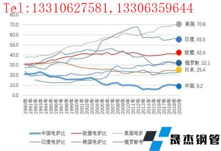 電爐鋼是以電力為能源、以再生鋼鐵料為原料的煉鋼爐生產(chǎn)的鋼。這種短流程煉鋼與以鐵礦石為主要原料的長流程煉鋼在原料使用上有本質(zhì)的區(qū)別。從電爐鋼的占比情況看,中國粗鋼生產(chǎn)90%以上依賴長流程,即以鐵礦石為主要原料的生產(chǎn)方式,并且受制于國產(chǎn)鐵精礦的產(chǎn)量不足,對(duì)進(jìn)口鐵礦石的依存度很高。截止到2020年,據(jù)世界鋼協(xié)(WSA)的統(tǒng)計(jì)數(shù)據(jù),全球電爐鋼產(chǎn)量占比為26.1%。主要產(chǎn)鋼國中,美國為70.6%,土耳其為69.2%,印度電爐比為55.5%,歐盟(28)為42.4%,俄羅斯為32.1%,韓國為31.0%,日本為25.4%。中國電爐鋼占比在20世紀(jì)90年代曾超過20%,但由于之后中國長流程煉鋼規(guī)模迅速擴(kuò)大,電爐鋼占比不斷被稀釋,至2020年已降至9.2%。從目前情況看,美國、印度和歐盟鋼鐵生產(chǎn)對(duì)鐵礦石依存度相對(duì)低很多。