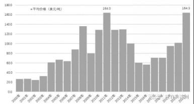 2000年-2021年中國進(jìn)口鐵礦石年度平均價(jià)格走勢(shì)圖