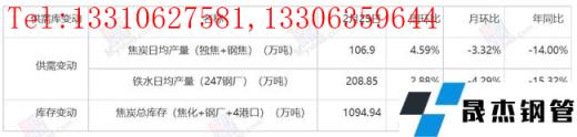 目前無縫厚壁鋼管廠家利潤尚可,對于焦價有包容空間;但近日鋼坯價格接連下跌,無縫厚壁鋼管廠家利潤逐步收縮,若鋼價繼續(xù)下跌,焦炭上漲,無縫厚壁鋼管廠家利潤收到擠壓,無縫厚壁鋼管廠家很難再接受焦炭漲價,畢竟焦炭的供應也并非特別緊張。