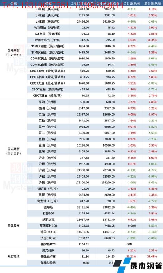 免責聲明:本網(wǎng)站(山東聊城晟杰無縫鋼管廠www.frdimp.com)刊載的“受近期局勢影響大宗商品價格一覽表(2月28日)”等均源于網(wǎng)絡,版權(quán)歸原作者所有,且僅代表原作者觀點,本文所載信息僅供參考。轉(zhuǎn)載僅為學習與交流之目的,如無意中侵犯您的合法權(quán)益,請及時聯(lián)系刪除。本網(wǎng)站刊登此篇文章并不意味著本站贊同其觀點或證實其內(nèi)容的真實性,我們不對其科學性、嚴肅性等作任何形式的保證。如果侵犯了您的版權(quán),請盡快聯(lián)系我們予以撤銷,謝謝合作!