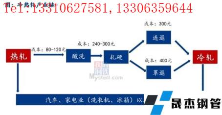 由于熱軋是冷軋的原料,調(diào)研了解有近40%的熱軋被用來生產(chǎn)冷軋,而且冷熱軋終端需求分布有部分重合,因此冷軋與熱軋價格走勢高度類似。冷軋板卷是以熱軋卷為原料,在室溫下經(jīng)過酸洗(費用80-120元/噸)、軋制(費用240-300元/噸),然后連退(費用300元/噸)或罩退(費用400元/噸)而成,冷軋成本較熱軋多出620-820元/噸。從下游需求分布來看,冷熱軋終端需求分布有部分重合,冷熱軋均被用于汽車、家電業(yè)(洗衣機、冰箱)以及產(chǎn)業(yè)設(shè)備等。