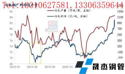 由于考慮到訂單、排產(chǎn)、后續(xù)市場情況等多種因素,無縫厚壁鋼管廠家生產(chǎn)計劃需提前制定,因此無縫厚壁鋼管廠家不會輕易減少產(chǎn)量。我們分析歷史情況發(fā)現(xiàn),在虧損較大后,冷軋產(chǎn)量才會有明顯的下降。由于2021年政策影響較大,我們選取2019-2020年冷軋無縫厚壁鋼管廠家的產(chǎn)量和利潤情況發(fā)現(xiàn),產(chǎn)量最低的兩個時間點分別為2019年5月底以及2020年5月底,這兩個時間點對應(yīng)的冷軋利潤也到達最低點,分別為-450元/噸和-279元/噸。