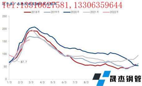 庫存方面,截止2月28日,根據(jù)廣州建材倉庫同口徑統(tǒng)計,建筑厚壁無縫鋼管總庫存156.1萬噸,周環(huán)比增加3.92萬噸,連續(xù)6周回升。其中螺紋鋼庫存92.7萬噸,周環(huán)比增加5.06萬噸;線材63.4萬噸,周環(huán)比減少1.14萬噸。近年來春節(jié)后廣東省庫存量均呈現(xiàn)增加態(tài)勢,其中2020年節(jié)后庫存總量最高;據(jù)調(diào)研,節(jié)后廣東建筑厚壁無縫鋼管庫存峰值均出現(xiàn)第3-5周,累庫周期約24天左右;雖然2022年節(jié)前價格偏高,但節(jié)前現(xiàn)貨價格上漲,帶動市場不少商家主動性囤貨、備貨,節(jié)前庫存總量并未出現(xiàn)明顯累庫現(xiàn)象。節(jié)后開市,在疫情等因素影響下,累庫速度遠(yuǎn)低于往年,因此預(yù)計短期庫存仍有增加的可能,但峰值難超去年,且最近2-3周可能會迎來庫存拐點(diǎn)。