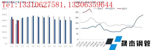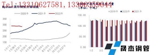 海外需求:國(guó)際鋼價(jià)震蕩下行,1月各國(guó)高爐生產(chǎn)運(yùn)行穩(wěn)定。截至2月25日,國(guó)際鋼鐵價(jià)格指數(shù)較上月底下降3.9個(gè)點(diǎn),降幅1.4%。世鋼協(xié)最新數(shù)據(jù)顯示,1月除中國(guó)外生鐵產(chǎn)量3841.1萬(wàn)噸,日均123.9萬(wàn)噸/天,環(huán)比上月增加0.1萬(wàn)噸/天,增幅0.1%。1月各國(guó)高爐生產(chǎn)運(yùn)行穩(wěn)定,目前的鋼價(jià)對(duì)無(wú)縫厚壁鋼管廠家生產(chǎn)積極性仍支撐,但是2月和3月,俄烏軍事行動(dòng)讓其涉及的高爐生產(chǎn)充滿不確定性,兩國(guó)1月生鐵產(chǎn)量占全球除中國(guó)外生鐵產(chǎn)量的17%。