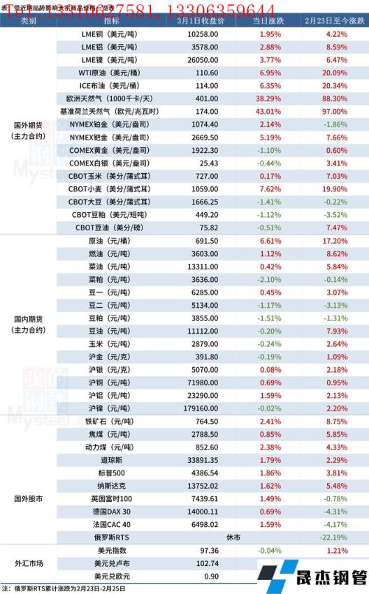 近期,受國際局勢影響,全球金融及大宗商品市場出現(xiàn)較大波動(dòng)。3月2日,多個(gè)大宗商品價(jià)格創(chuàng)多年新高,天然氣累計(jì)漲幅超80%,原油突破110美金。匯總情況如下: