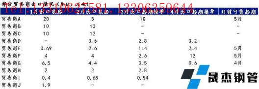 貿(mào)易商1:華北出口商。今年前兩個(gè)月合計(jì)出口在1萬噸左右,主要為鍍鋅產(chǎn)品,其中有部分之前延期的訂單。近期海外客戶對(duì)冷熱系產(chǎn)品詢單量明顯增加,多數(shù)為5月船期資源,目前正積極與無縫厚壁鋼管廠家及貨代公司溝通,盡量滿足客戶提出的交貨期。