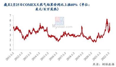 受俄烏沖突影響,截至2月25日,COMEX天然氣結(jié)算價4.485美元/百萬英熱,同比上漲60%。整個2月天然氣均價約為4.459,環(huán)比上漲12%,同比上漲54%,為2014年后的第二高點(diǎn)。