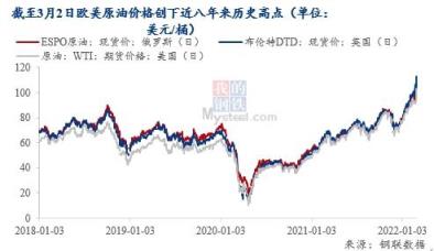 除了天然氣,原油也是俄羅斯主要出口能源類型之一。今年2月,俄羅斯的石油產(chǎn)量同比增長9.3%,達(dá)到1105.5萬桶/日。在俄烏沖突之下,原油價格飆升。截至3月2日,美油價格一度沖破了111美元/桶,布油價格一度接近113美元/桶,布油美油的價格都創(chuàng)近8年新高。