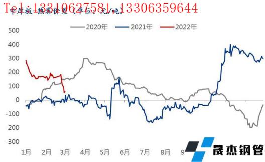 2021年的唐山限產(chǎn)是從3月份開始的,那么在2021年3月份之前這段時間里,全國中板的周產(chǎn)量達到了歷史新高,平均每周產(chǎn)量在135-145萬噸,在唐山限產(chǎn)政策出臺過后,中板產(chǎn)量才開始出現(xiàn)了下滑。反觀今年,由于冬奧會限產(chǎn)及采暖季限產(chǎn),導(dǎo)致今年的限產(chǎn)其實是提前到了一月份,據(jù)我們統(tǒng)計的數(shù)據(jù)顯示,2022年1-2月份中板平均周產(chǎn)量在120-124萬噸,那這個產(chǎn)量水平相當(dāng)于同比去年每周是減少了15-20萬噸,降幅是10-15%;從這方面來看,也能夠很好解釋,為什么今年春節(jié)前后,華北地區(qū)的價格上漲趨勢是又快又高,甚至高于華東地區(qū)價格,區(qū)域價差失衡。另一方面,從華東地區(qū)的調(diào)坯軋材無縫厚壁鋼管廠家春節(jié)期間檢修情況來看,今年的檢修時長明顯是比去年有延長,去年春節(jié)期間各調(diào)坯廠平均檢修時長是7天,今年部分無縫厚壁鋼管廠家受疫情原因影響,檢修時長延長至9-20天,也是進一步導(dǎo)致華東地區(qū)普板資源緊俏的原因。